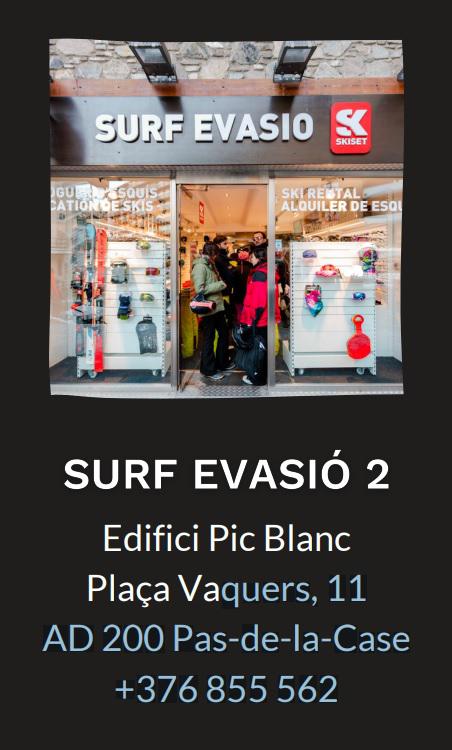 Le magasin « sports d’hiver » Surf Evasió 2, à 50m de la Résidence Consuegra, propose aux skieurs de tout niveau et au meilleur prix, le matériel le plus approprié pour dévaler les pistes de Grandvalira en tout confort et en toute sécurité. Enseigne emblématique de la location de skis au Pas de la Case, Surf Evasió 2 c’est également un sens de l’accueil reconnu et de multiples conseils et services distillés par une équipe chaleureuse et passionnée : choix du matériel le plus approprié, réservation de forfaits Grandvalira, de cours de ski ou snowboard, etc.